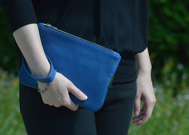 Luxurious blue leather clutch bag with wrist strap. Elegant clutch bag. Zip fastener. The leather clutch bag includes a removable wrist strap with snap hook. The leather clutch bag has an undivided interior and 100% cotton lining.
