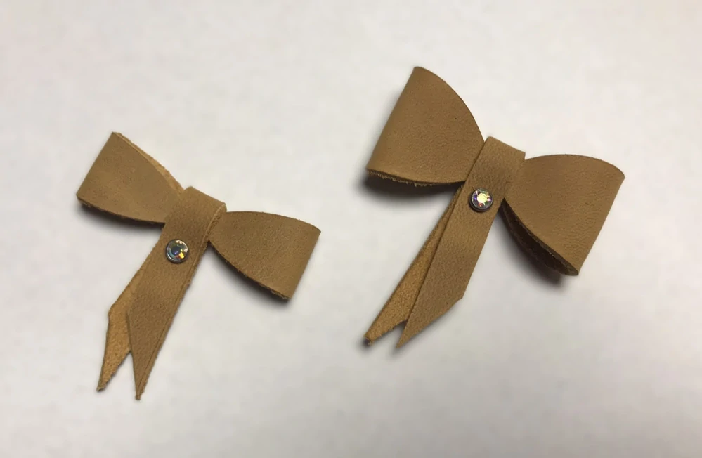 Kožená mašle má předdělané dírky na přišití, stačí jen přišít k požadovanému materiálu.
