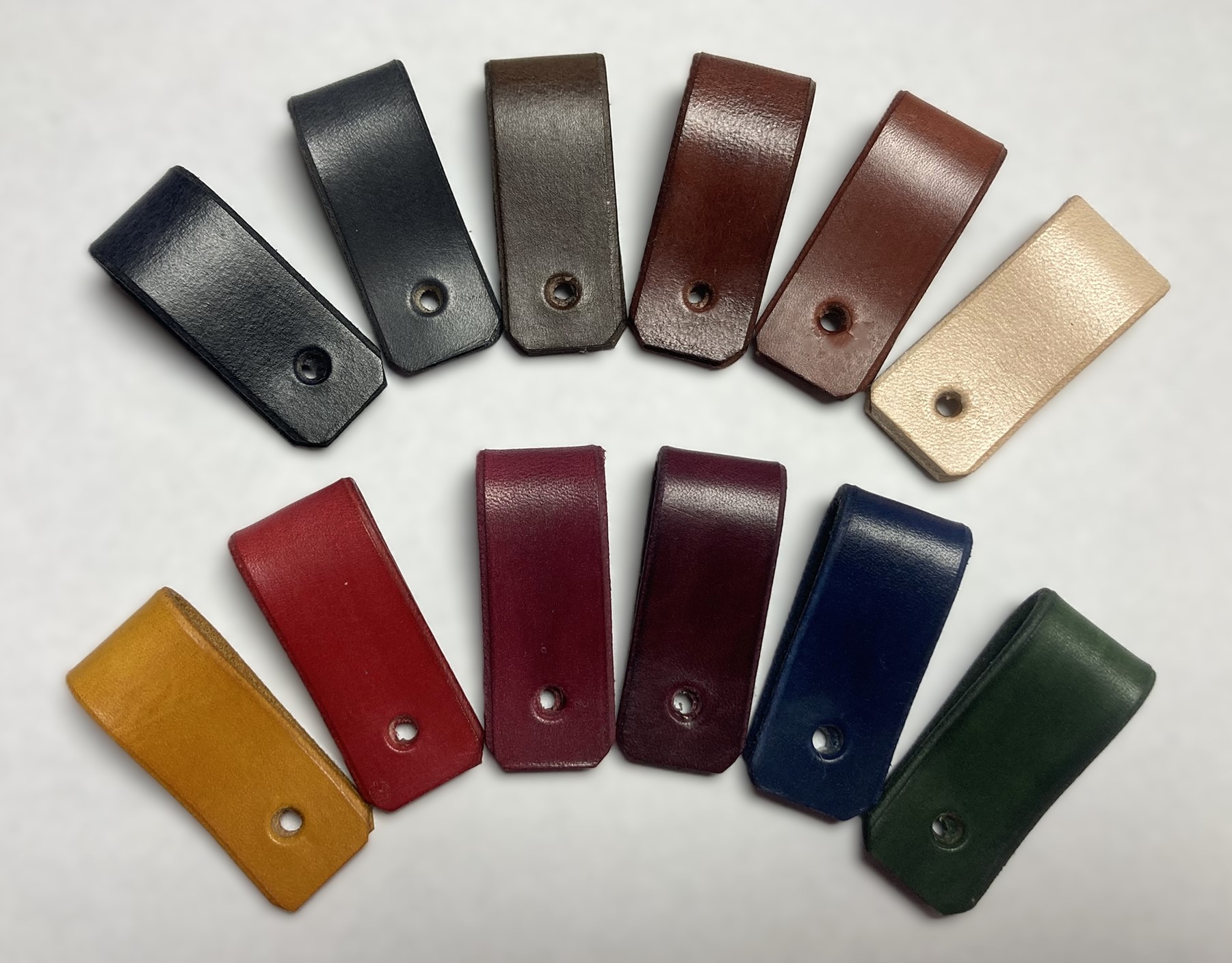 Ruční řemeslná výroba. Vyrobeno z hovězí usně - kůže 2 - 2,5 mm, barvené, impregnované. Kovový šroub není součástí balení. Průměr dírky 4 mm. Šířka: 2,4 - 2,5 cm. Kožená úchytka je k sobě přilepená.