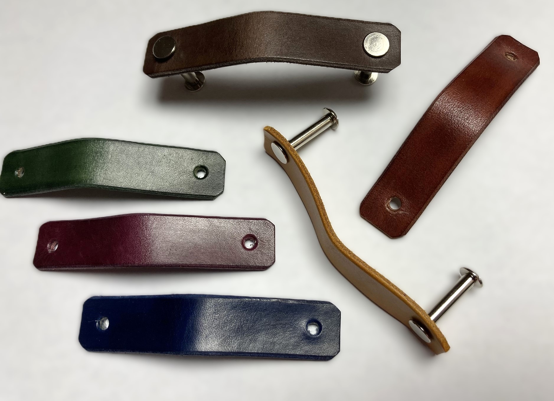 Ruční řemeslná výroba. Vyrobeno z hovězí usně - kůže 2 - 2,5 mm, barvené, impregnované. Kovové šrouby nejsou součástí balení. Průměr dírky 4 mm. Šířka: 2,4 - 2,5 cm.