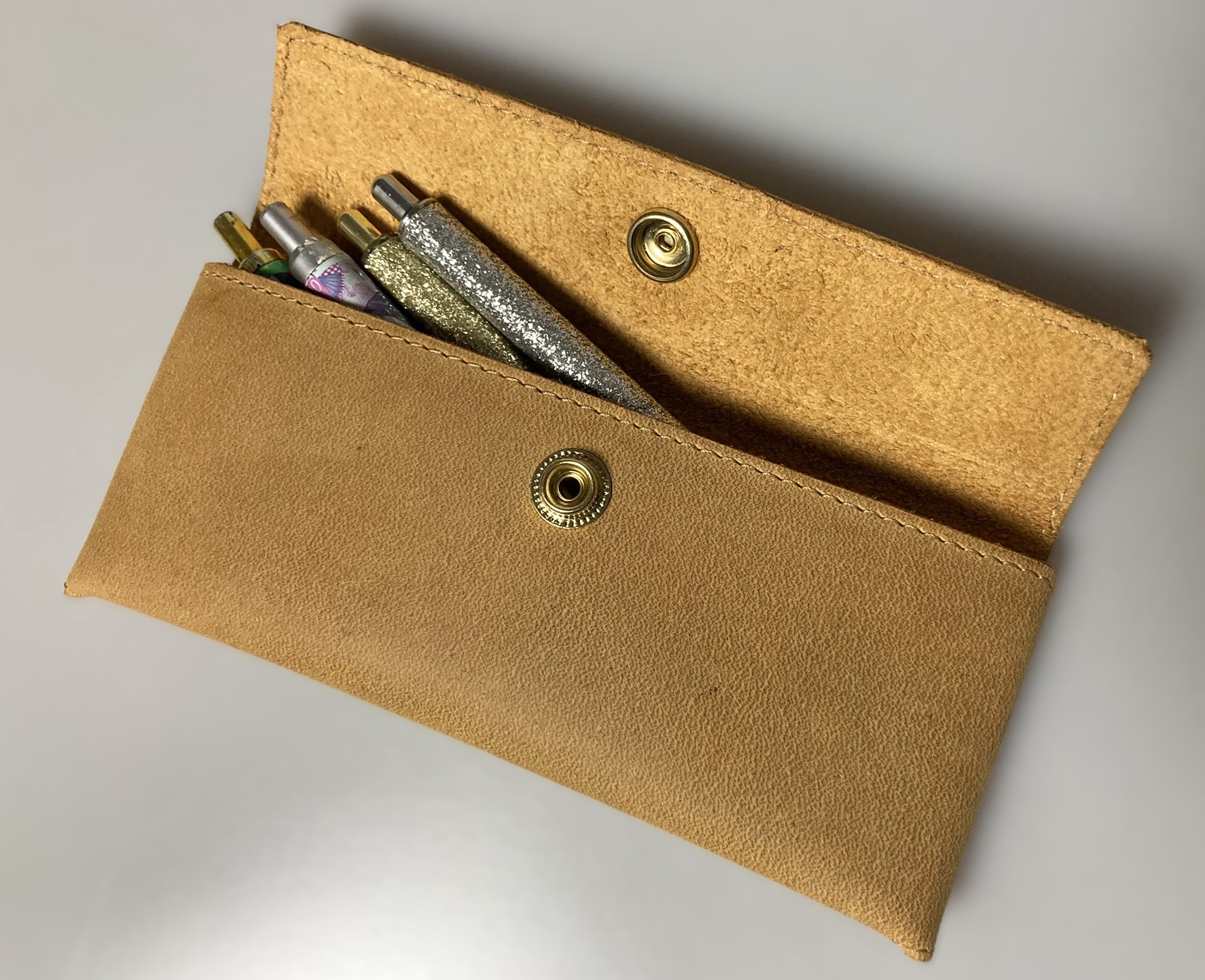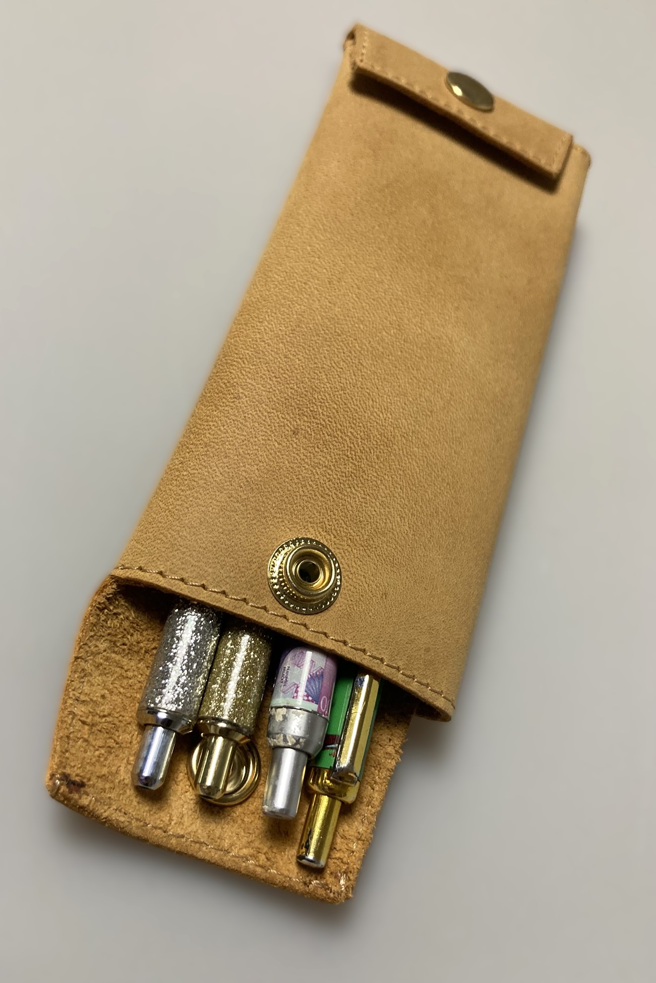 Stylové kožené pouzdro je elegantní ochranou pro psací potřeby. Je velmi praktické a pohodlné. Zavírání na zlaté druky. Kožený penál otevřete pomocí druků na třech místech ( klopa a po stranách ) a vaše tužky, propisky, fixy budete mít kdykoliv po ruce. Do penálu se vejde cca 6 klasických propisek.