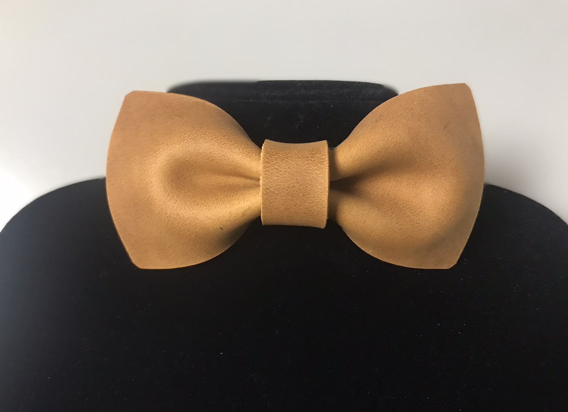 Stylish leather bowtie. Fastens to an elastic black velvet band, 1.6 cm wide. The band is comfortable and elastic. Adjustable length to suit neck size. Easy to attach to black plastic bowtie clip.