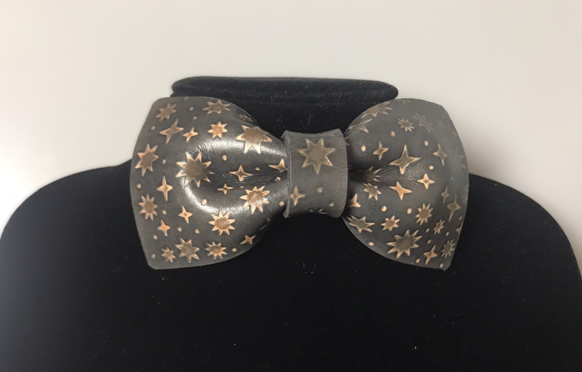 Stylový, originální kožený motýlek - hvězdy. Zapínání je na černé sametové pružence šířka 1,6 cm. Pruženka je pohodlná, pružná, elastická, délka nastavitelná dle krku. Jednoduché uchycení okolo krku na černé plastové motýlkové zapínání.