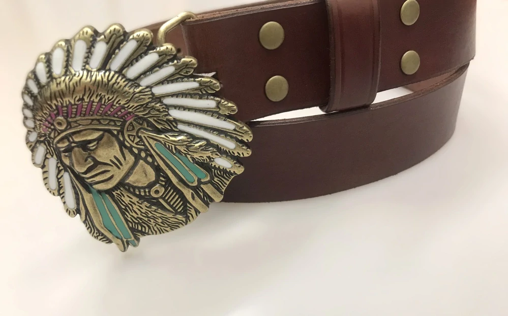 Opasek na běžné každodenní nošení. Kožený opasek doplňuje originální motiv přezky s indiánem ve stylu western. Opasek je ideální volbou pro všechny, kteří hledají jedinečný doplněk s osobitým charakterem.