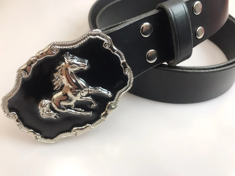 Opasek na běžné každodenní nošení. Kožený opasek doplňuje originální motiv přezky s koňem. Opasek je ideální volbou pro všechny, kteří hledají jedinečný doplněk s osobitým charakterem.