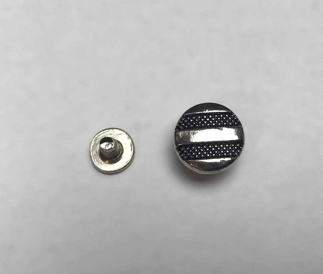 Zdobený šroubovací nýt - proužky. Opaskový šroub s nepřehlédnutelným vzorem dodá vašim výrobkům potřebnou eleganci a styl.Využití na opasky pro výměnu přezky, k uchycení uch na kabelky apod. Stačí jednoduše zašroubovat.